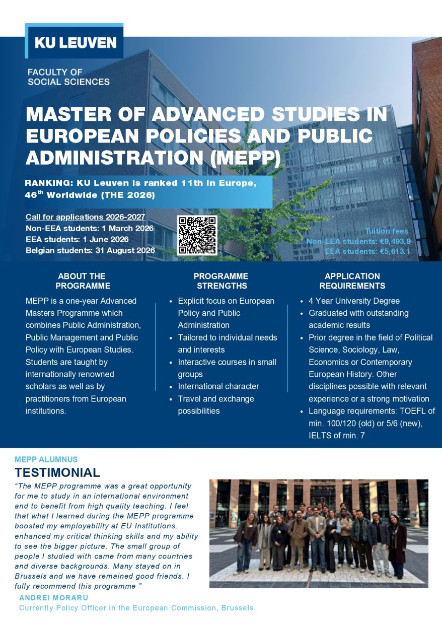 This programme is a one-year Advanced Masters that builds on the international reputation of KU Leuven and develops a course that prepares students for careers in governments, international bodies and research. With an explicit focus on European countries and the European Union, and the comparative aspect of research, MEPP is a rigorous and valuable course for individuals interested in the EU and Europe.